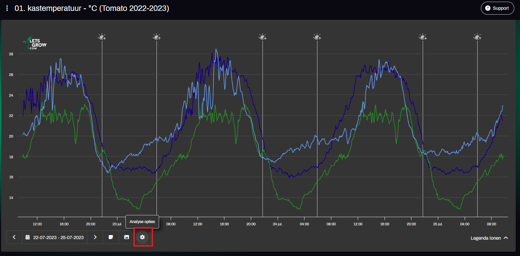 The "Deviation" option creates a non-visible average line of the lines present in the graph from which the adjustable deviation is determined. The area of deviation is then greyed out so that a line is only shown when it falls outside the set deviation. This option can also be combined with the "Group by hour" and "Time shift" options.
