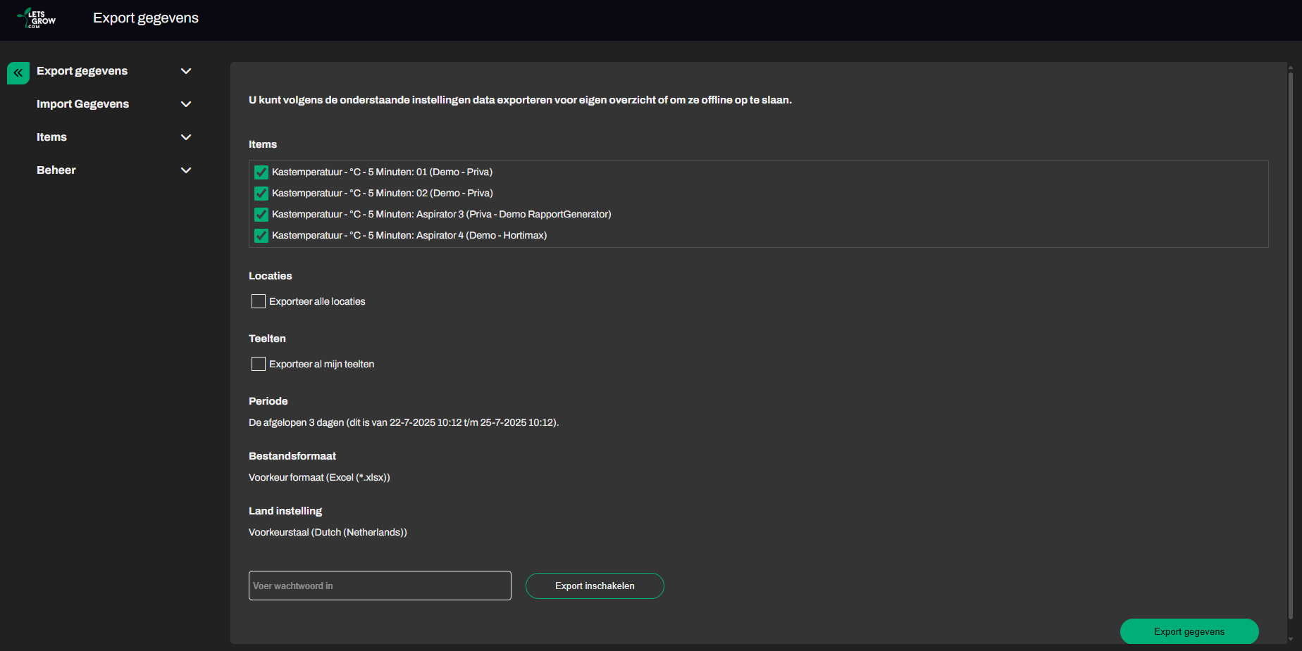 When you check ‘Export all locations’, all locations where measurements were taken will be included in the export. This is relevant, for example, for plant registrations where multiple measurement points (locations) are recorded. If you do not select this option, only the average values will be exported.