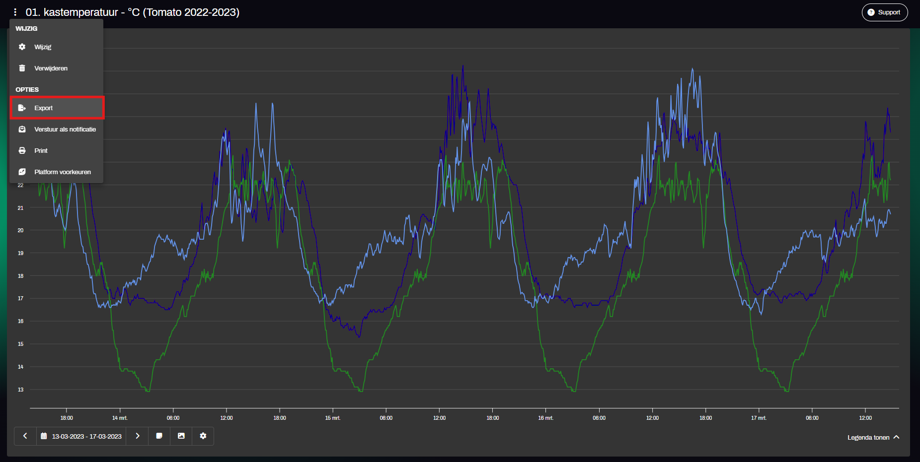 By default, the export period matches the period displayed in the chart. To adjust this, go to ‘Export Data’ in the top left corner of your screen and then select ‘Select Period’.