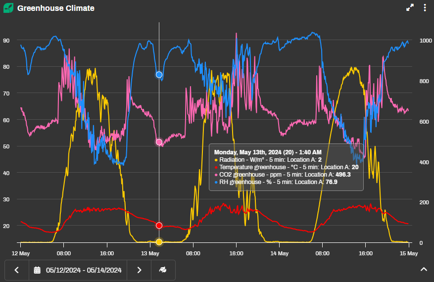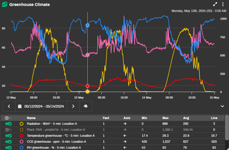 When you move your mouse over a graph while the legend is hidden, a small info box appears next to your cursor with details for that specific moment. It shows the date, time, item names, their unit of measurement, and the values at that point in time.