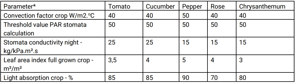 * The parameter values listed here are based on a fully grown crop. In the initial stage