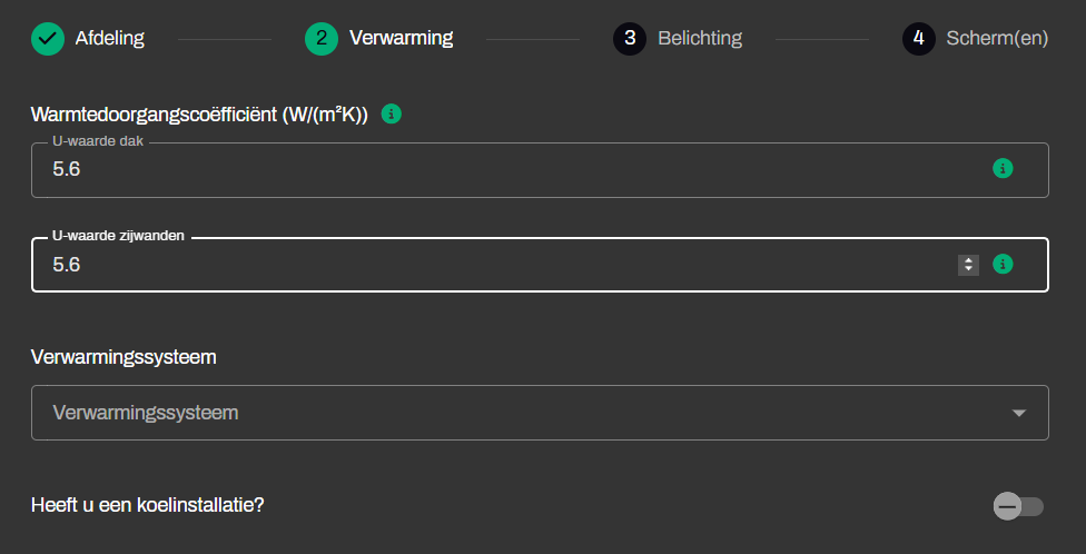 Door op “Volgende” te klikken, kom je bij het tweede scherm, waar informatie over isolatie en verwarming nodig is. De U-waarde van het dak en de zijwanden zijn eigenschappen van het kasmateriaal. Deze waarde kun je vinden door het type en de naam van je kasmateriaal te controleren.