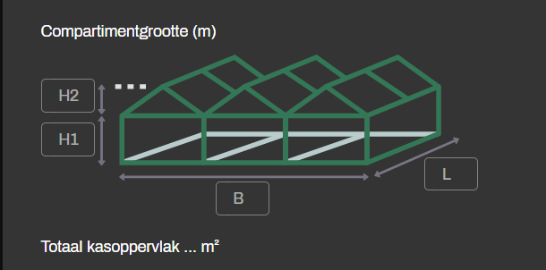 In het eerste scherm (van in totaal 4) geef je een naam aan het compartiment en kies je het type kas (A-frame of gebogen dak). Ook het aantal kappen moet worden ingevuld. De afmetingen van het compartiment moeten in meters worden opgegeven.