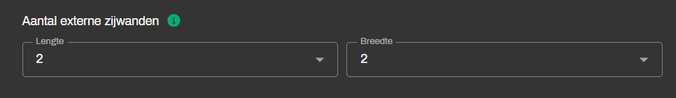 Tot slot moet je het aantal externe zijwanden invullen. Dit is het aantal wanden dat in contact staat met de buitenlucht. Als je compartiment aan alle zijden grenst aan buitenlucht, is het volledig vrijstaand en vul je 2x2 in. Als je compartiment geen zijwanden heeft die grenzen aan buitenlucht, is het volledig ingesloten en vul je 0x0 in.