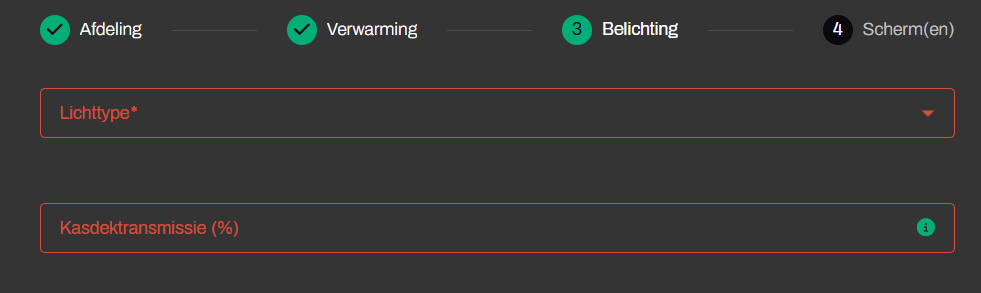 Door op “Volgende” te klikken, kom je bij het derde scherm, waar de parameters voor belichting worden ingevuld. In het dropdownmenu kun je kiezen tussen Geen, HPS (SON-T), LED of Beide/hybride. Bij HPS (SON-T) of LED moet je het aantal armaturen en het gemiddelde vermogen per armatuur invullen. Je kunt de armatuurrendement standaard op 80% laten staan, tenzij je het exacte percentage weet van hoeveel licht daadwerkelijk op het teeltoppervlak terechtkomt.