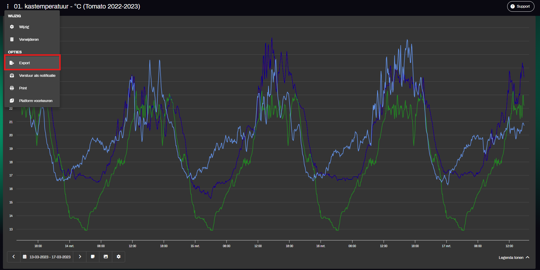 De exportperiode komt standaard overeen met de periode die in de grafiek is ingesteld. Wilt u deze aanpassen, ga dan linksboven in uw scherm naar 'Export gegevens' en selecteer vervolgens 'Periode selecteren'.