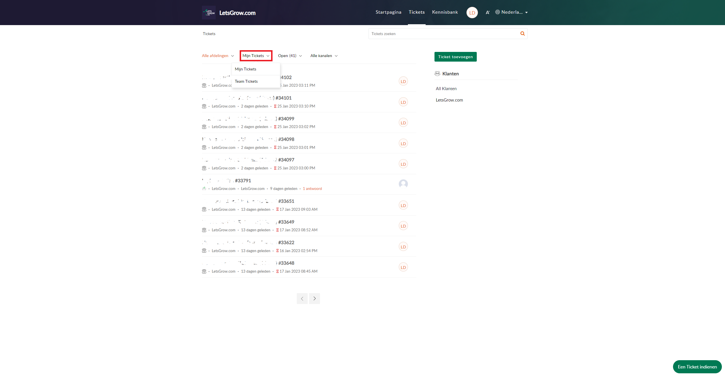 Om de tickets van uw team te zien (als er meerdere accounts binnen het team aanwezig zijn) klikt u op de drop down en kunt u wisselen tussen "Mijn Tickets" en "Team Tickets". U zal bij het wisselen naar "Team Tickets" alle tickets van het team in kunnen zien en hier eventueel ook reacties op kunnen achterlaten voor collega's en de service desk van LetsGrow.com.
