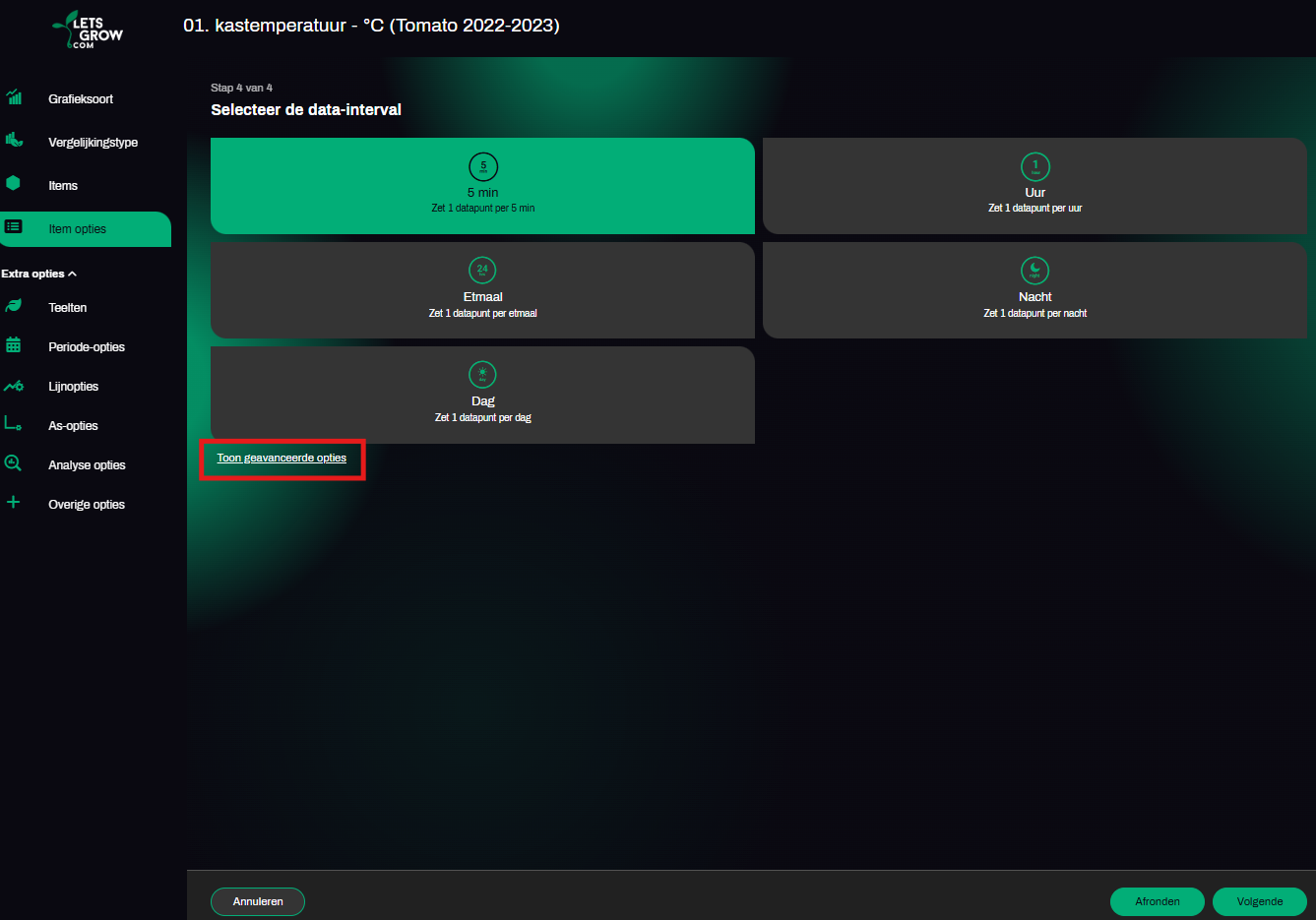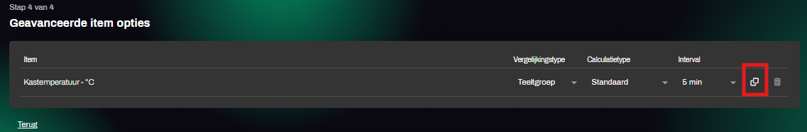 De geselecteerde interval geldt in eerste instantie voor alle items in uw grafiek. Mocht u dit willen veranderen, druk dan op "Toon geavanceerde opties" en verander de interval per item zoals gewenst. U kunt hier ook eenzelfde item meerdere keren in uw grafiek laten voorkomen met een andere interval. Klik hiervoor op kopieer item (rood kader), en stel vervolgens een ander interval in bij het gekopieerde item.