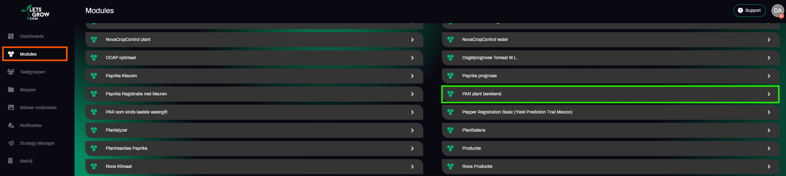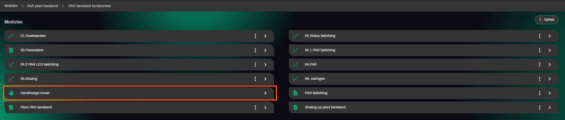 worden. Voor het instellen van de module moet er handmatig parameters ingevuld worden. De handmatige invoer vind je onder de module knop (oranje kader) en klikt je op de juiste module "PAR plant berekend" (groene kader). Klik nu de juiste module die je aangepast wilt hebben, dit heeft vaak de naam van de corresponderende locatie of afdeling.