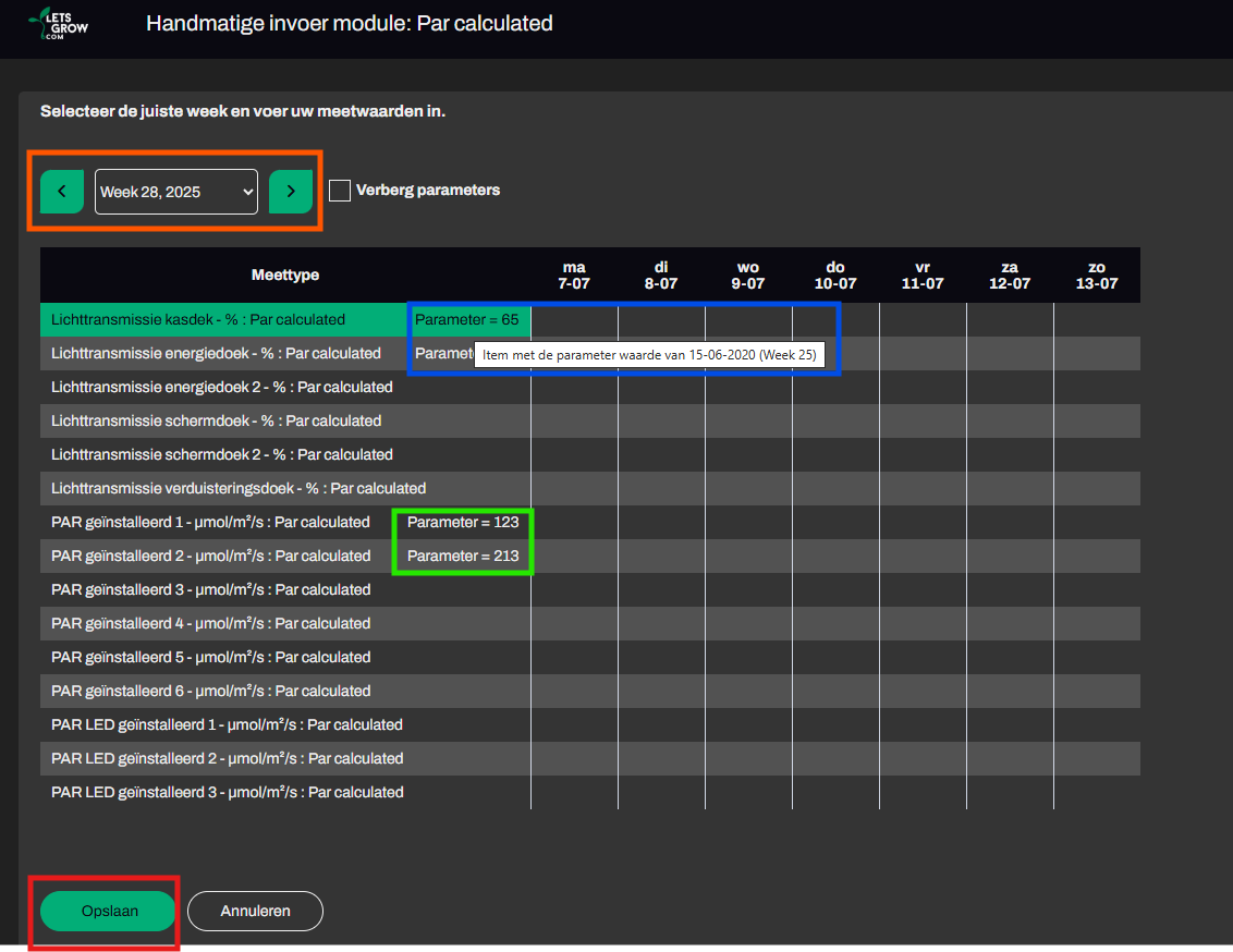 De waarden van de parameters moeten worden ingevuld op de eerste startdag van de module. Je kan met de pijltje naar de juiste week navigeren (oranje kader). De parameters kan je op de dag invullen en worden de weken daarna meegenomen totdat je een nieuwe waarde invult dan veranderd de waarde (groene kader). Je kan checken wanneer je waarde ingevuld hebt door op de parameter waarde te zweven met je muis (blauwe kader). Als je dingen hebt gewijzigd in dit overzicht klik op opslaan om de verandering door te voeren (rode kader):