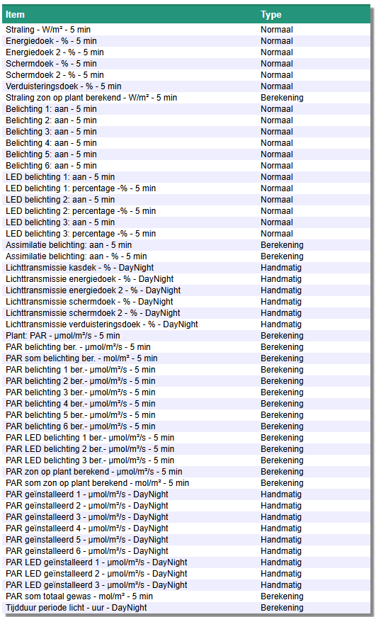 Hiermee wordt aangeduid of er in de kas belichting aan staat. De verschillende soorten geconfigureerde belichting worden hier bij meegenomen.