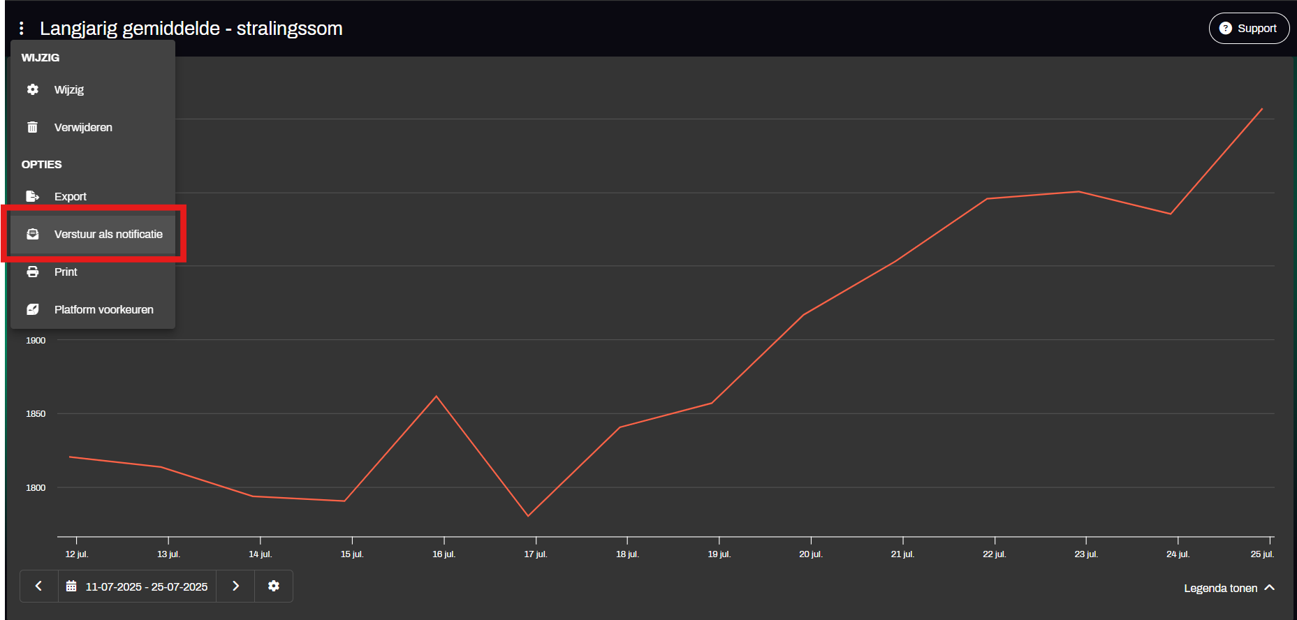 Om een grafiek als notificatie te versturen, klikt u linksboven in het scherm op de drie puntjes. Vervolgens kiest u "Verstuur als notificatie".